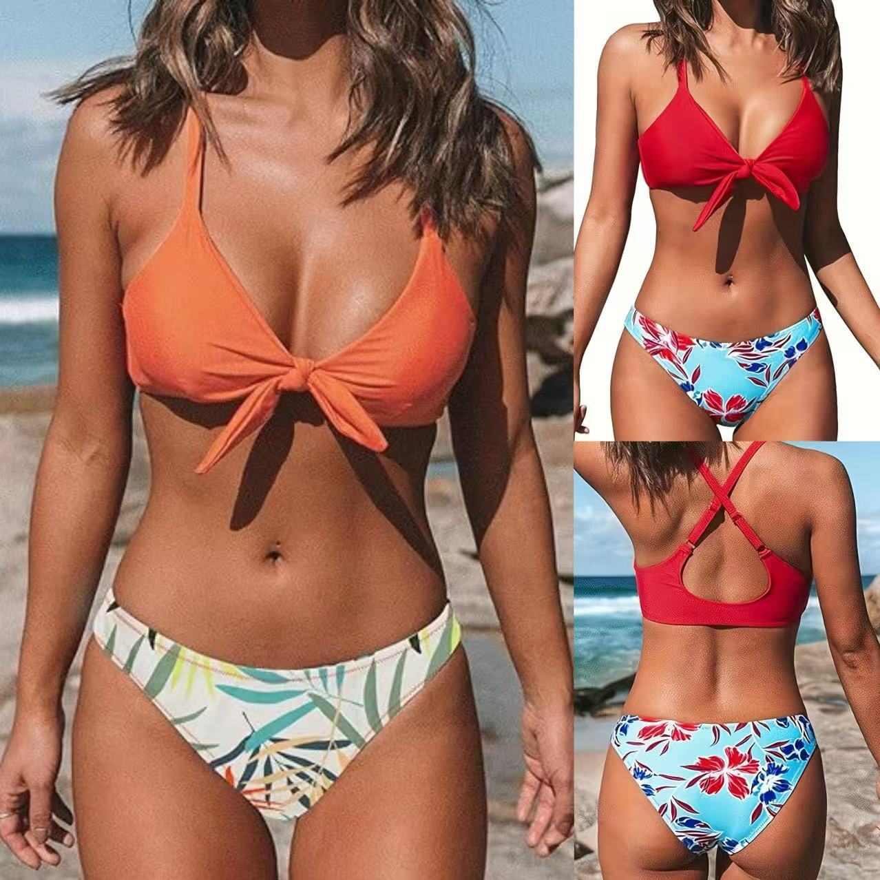 Split Bikini V-Neck Backless Knot Swimsuit Solid Color Swimsuit for Women